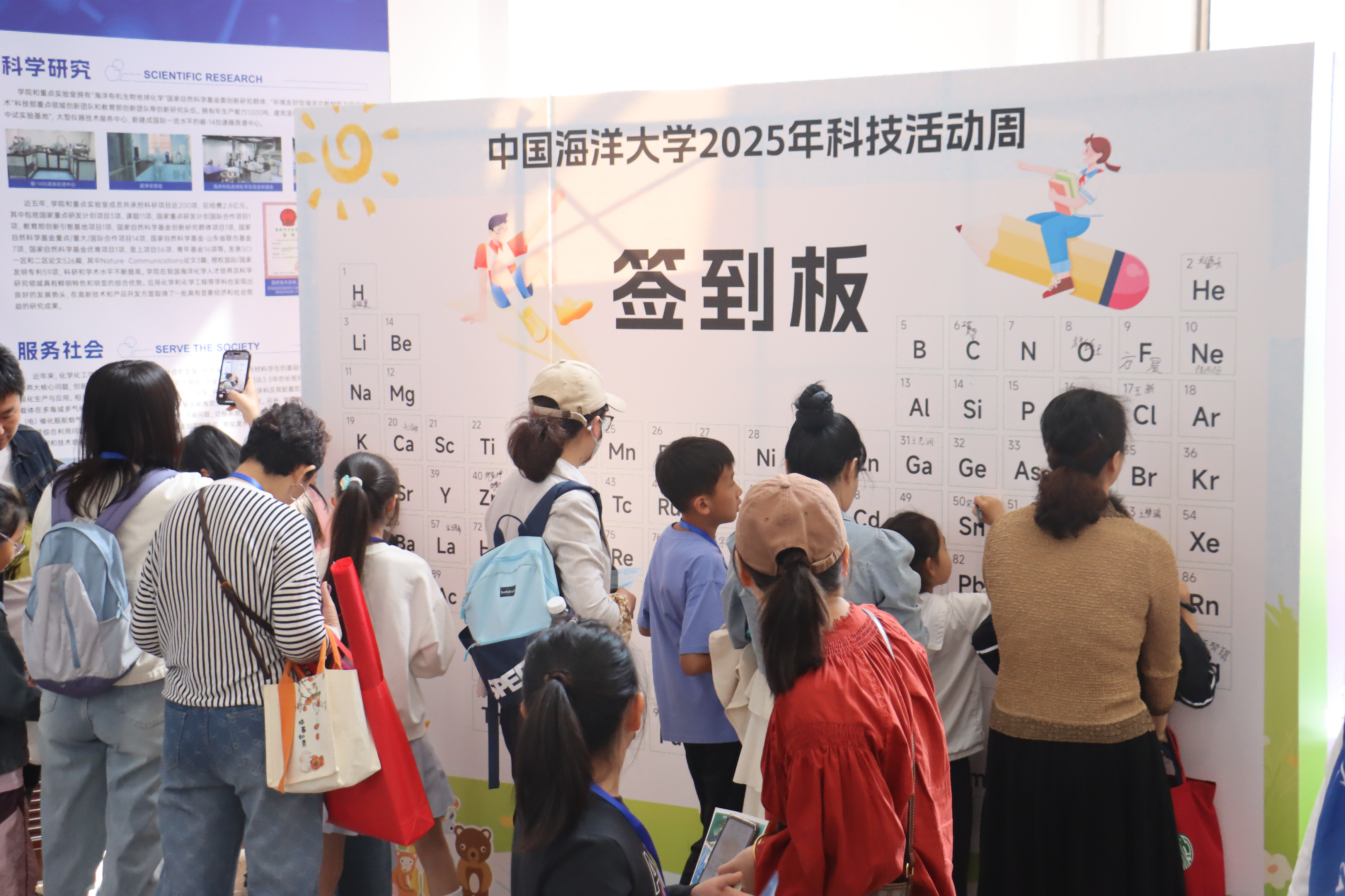 活动在化学化工学院一楼大厅开幕。志愿者们热情地为中小学生讲解生活中海洋与化学的科普知识,针对常见生活现象进行深入浅出的阐释,让孩子们领悟到看似平常的现象背后,隐藏着深奥的化学知识,深切感受到化学在日常生活中的重要意义。学生和家长们纷纷在签到板和拍照打卡处留下美好的瞬间,记录下这段充满意义的科学之旅。