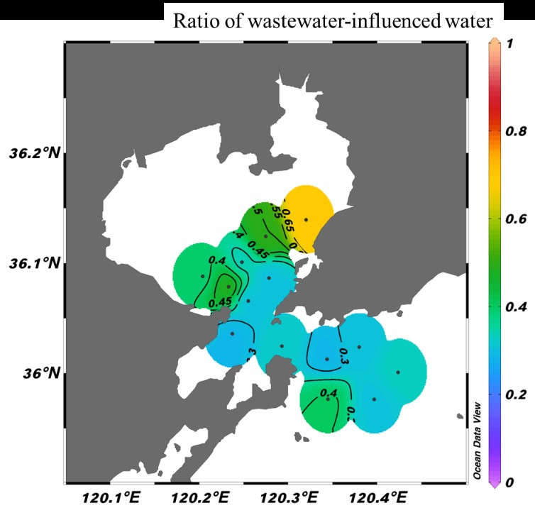 本研究在典型半封闭海湾——胶州湾的不同季节均检测到显著水平的Gdanth(2.8~25.8 pmol/L)。基于质量守恒模型结果表明,污水处理厂排放是胶州湾Gdanth的最主要来源,贡献占比高达86 ± 18%,而河流输入、大气沉降及地下水排放等途径的贡献可忽略不计(图1)。值得注意的是,尽管青岛市环湾污水处理厂排放的Gdanth浓度相对较低,但由于排放水量大,其年通量已达到全球同类区域的较高水平。本研究创新性地利用Gdanth作污水排放示踪剂,通过两端元混合模型量化了胶州湾东北部受污水影响的水体,约21 ± 5%被输送至南黄海沿岸(图2)。该研究首次系统阐明了胶州湾Gdanth的收支平衡、来源贡献及迁移路径,为沿海新污染物管控提供了关键科学依据,同时凸显了强化污水处理厂排放监测的紧迫性。