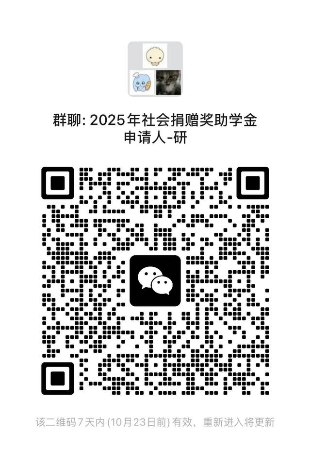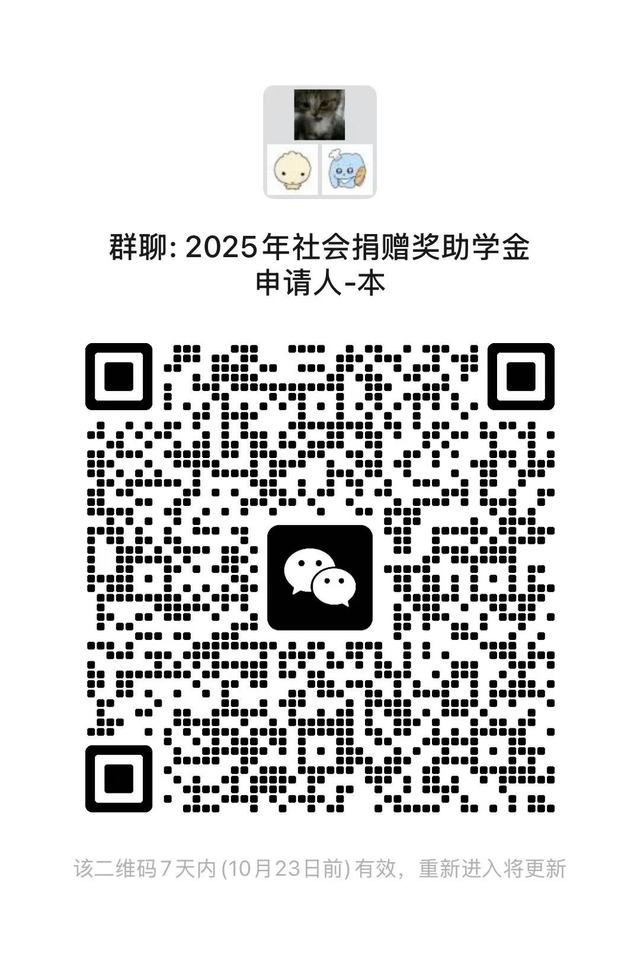 有意申请本年度社会捐赠奖助学金(除第三届中集助学金)的学生按照培养层次填写附件2或附件3,于10月19日中午12点前提交至指定邮箱并扫码入群。