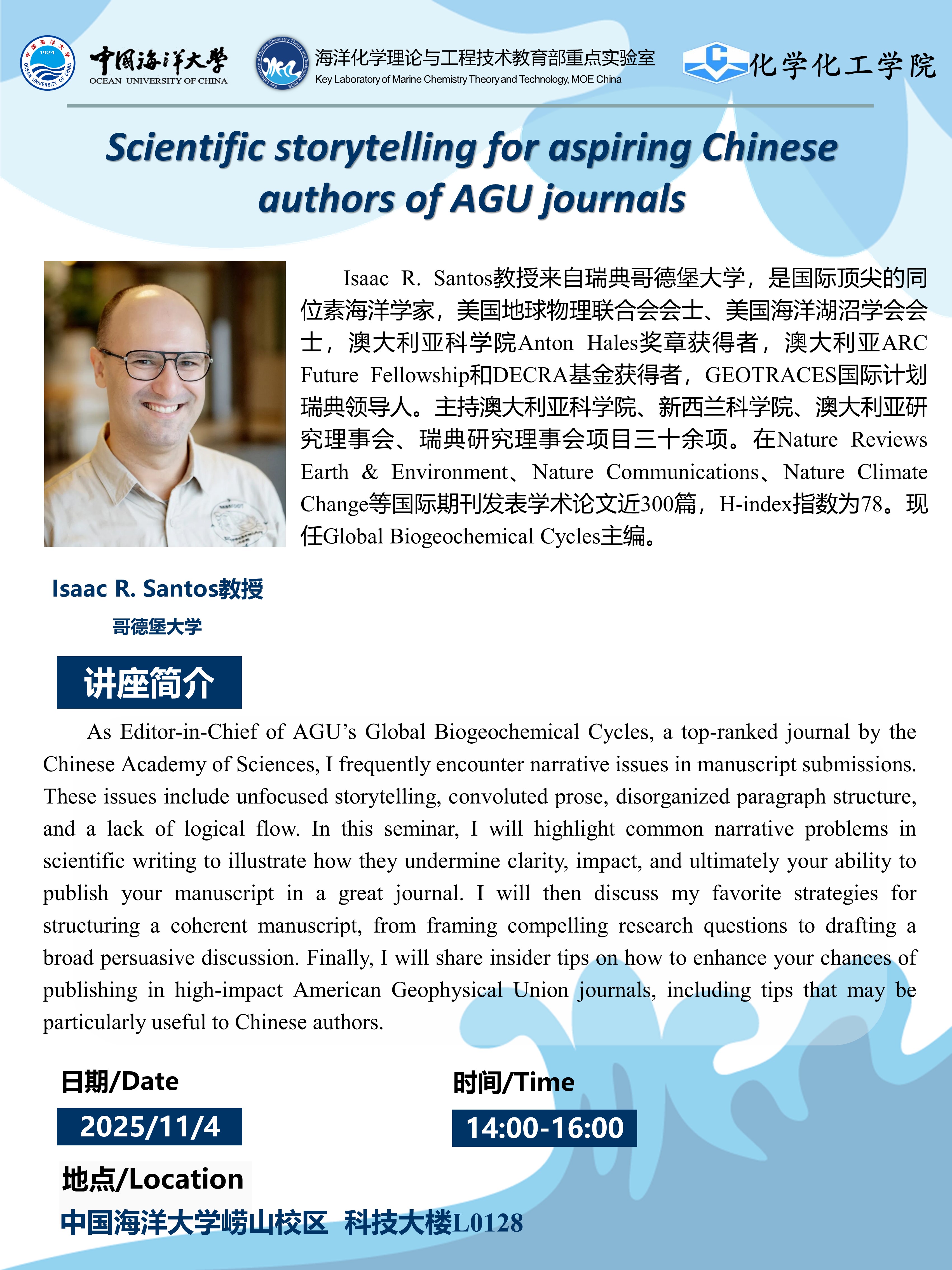 Isaac R. Santos教授报告:Scientific storytelling for aspiring Chinese authors of AGU journals