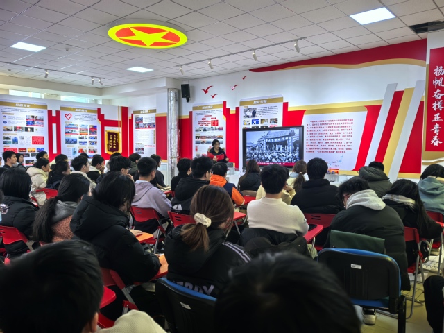 共青团宣传教育展厅志愿者围绕“青春百年心向党”“永立潮头担使命”“扬帆起航正青春”三个篇章为师生细致讲解展厅内的展陈内容,带领大家重温青年与团的百年联结、感悟新时代青年的责任担当,让青春奋斗的精神在讲解中传递。