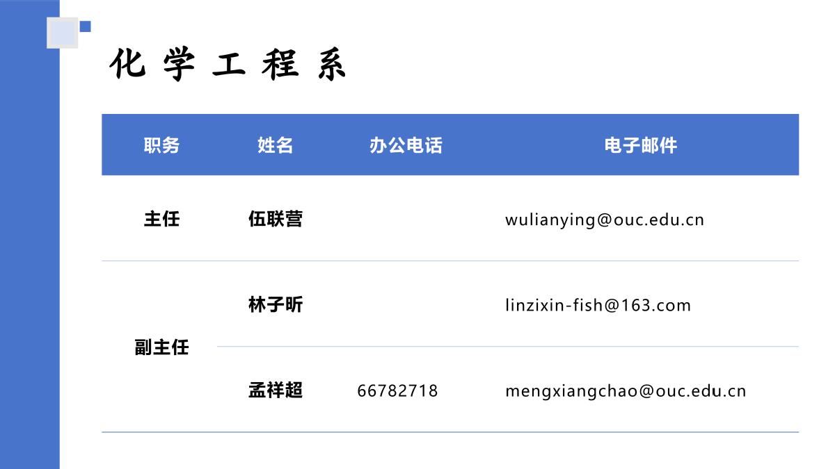 化学化工学院化学工程系成立于2002年,现有化学工程与工艺本科专业1个,化学工程与技术一级硕士学位点1个,海洋化学工程与技术博士点1个。目前在校本科生120人,研究生150多人。