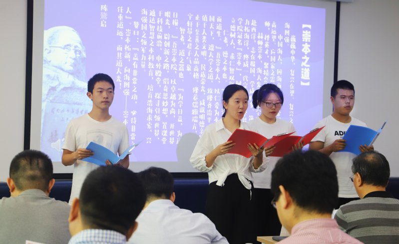 会议开始,孟老师介绍了崇本学院的院歌《问道沧海》,在悠扬的音乐声中拉开了见面会的序幕。而后,袁永康、赵田浩、奇元琦、郭辰洋四位同学深情朗诵了《崇本之道》,体现了崇本学子仁智双彰的理想追求和积极向上的精神风貌。