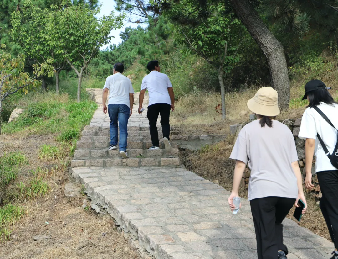 师生一行选择海大东南方向,牟家馨苑东侧的山路上山。在山路的入口处,向山脚望去,是已经奠基的海大附属学校在建工地,李主任向我们介绍了附属学校的发展规划,同高会旺院长共同憧憬未来崇本学院与附属学校的合作前景。