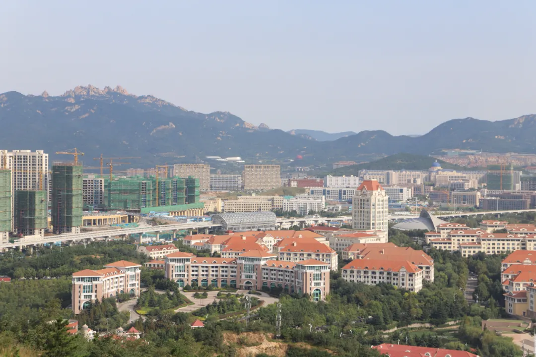 西南方向,在邻山间隔处,露出了海岸,海天一色的背景下,只有几艘小船显示出海的存在。回首北方,是整个海大崂山校区,不识海大真面目,只缘未登将军亭。
