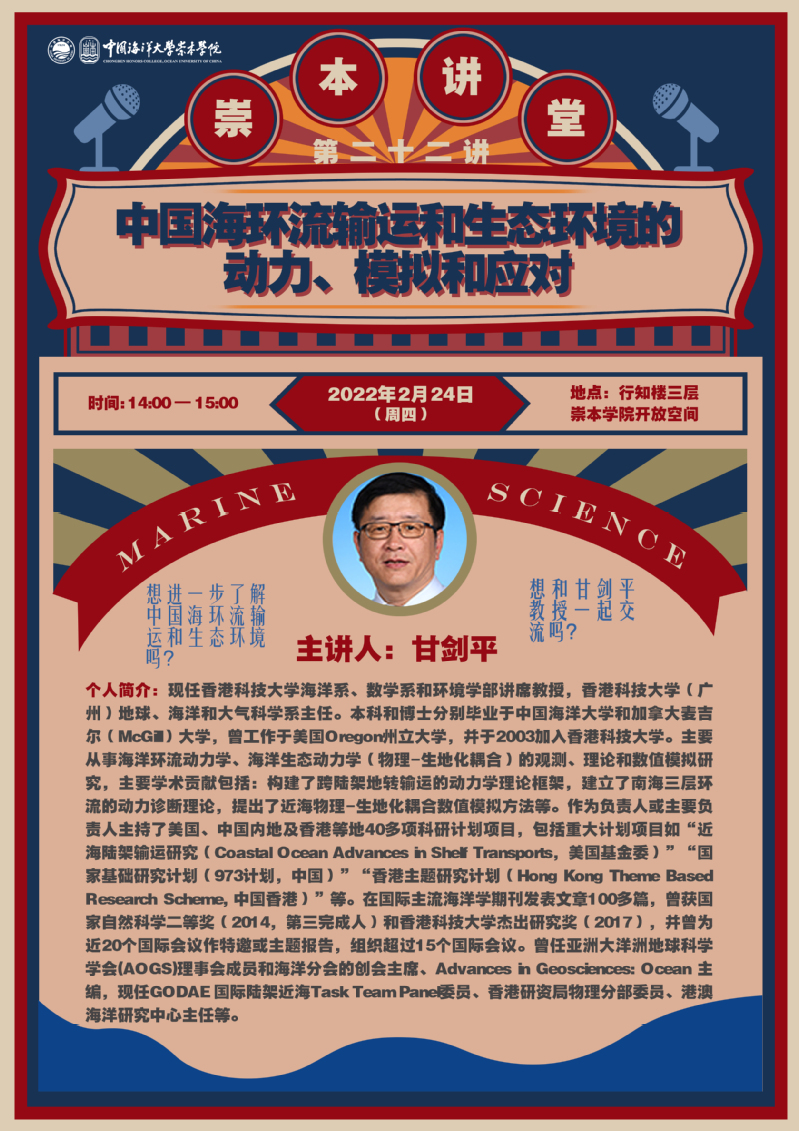 崇本讲堂第二十二讲:中国海环流输运和生态环境的动力、模拟和应对