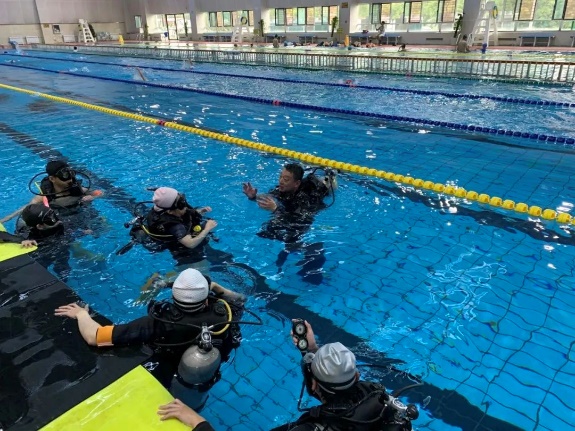 《海洋科学潜水》课程分两部分进行教学,《海洋科学潜水I》讲授游泳运动、水上安全技能与浮潜理论和应用技术,使学生掌握潜水器材构成及养护、潜水环境、潜水计划等内容。通过《海洋科学潜水I》课程考核、成绩优秀的学生,可以进入下一阶段《海洋科学潜水II》的学习,主要包括水肺潜水、潜水理论与技术、海洋科学调查等内容,分为平静水域课程与开放水域课程。