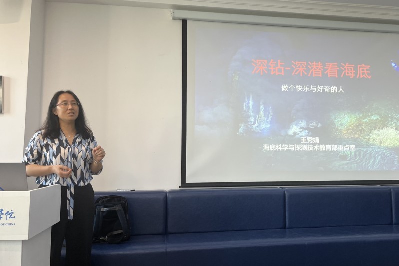 随后,王教授深入讲解了深潜、钻探和勘探的相关内容,详细说明了当今我国在陆域钻探方面的现状,目前我国钻探深度已达一万米,且钻探深度越大,难度呈指数级上升。尤其是海上钻探,涉及到固定仪器等问题,难度更大。此外,王教授还介绍了大洋钻探中的“决心号”“地球号”以及欧洲特定任务平台的优缺点,阐述了船上的人员组成和有趣的活动,并详细介绍了我国最先进的“梦想号”钻探船。为了让同学们更直观地了解深海探测,王教授还展示了海马冷泉和沉船考古等有趣的视频。