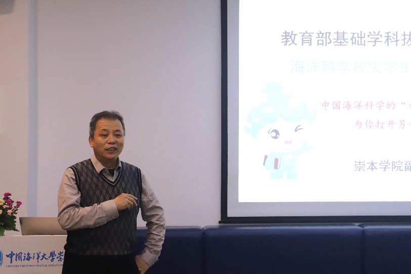 宣讲会开始后,赵栋梁副院长首先对崇本学院暨海洋科学拔尖学生培养基地做了基本介绍。从“钱学森之问”到教育部基础科学拔尖计划的由来,赵院长详细介绍了崇本的教学理念、培养计划及育人成果,同时表达了对青年学子的殷切期望,也表达了对热爱海洋科学、拟报考崇本学院同学的热烈欢迎。