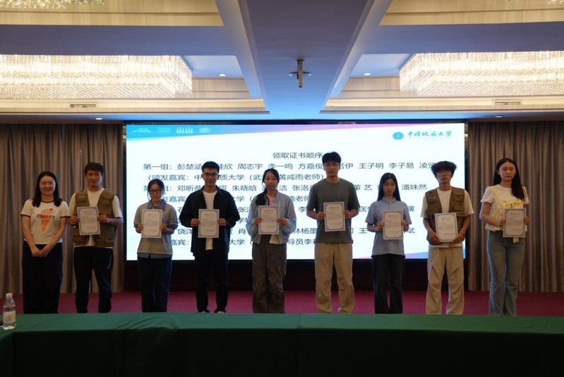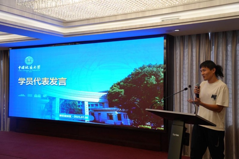 结营仪式上,崇本学院沈思同、董世昊、王一旸、林杨墨妍四位同学进行了题为“神农架大九湖湿地水文系统和大气的相互影响”的小组展示汇报;詹言珷同学作为营员代表发言,他分享了自己作为非专业地质学生在实践中的新视野与新收获,感叹于地质工作者深厚的知识储备和科研精神,体会了学科交叉的趣味和价值,同时对带队老师的悉心指导和不同学校营员们提供的多元视角表达感谢。