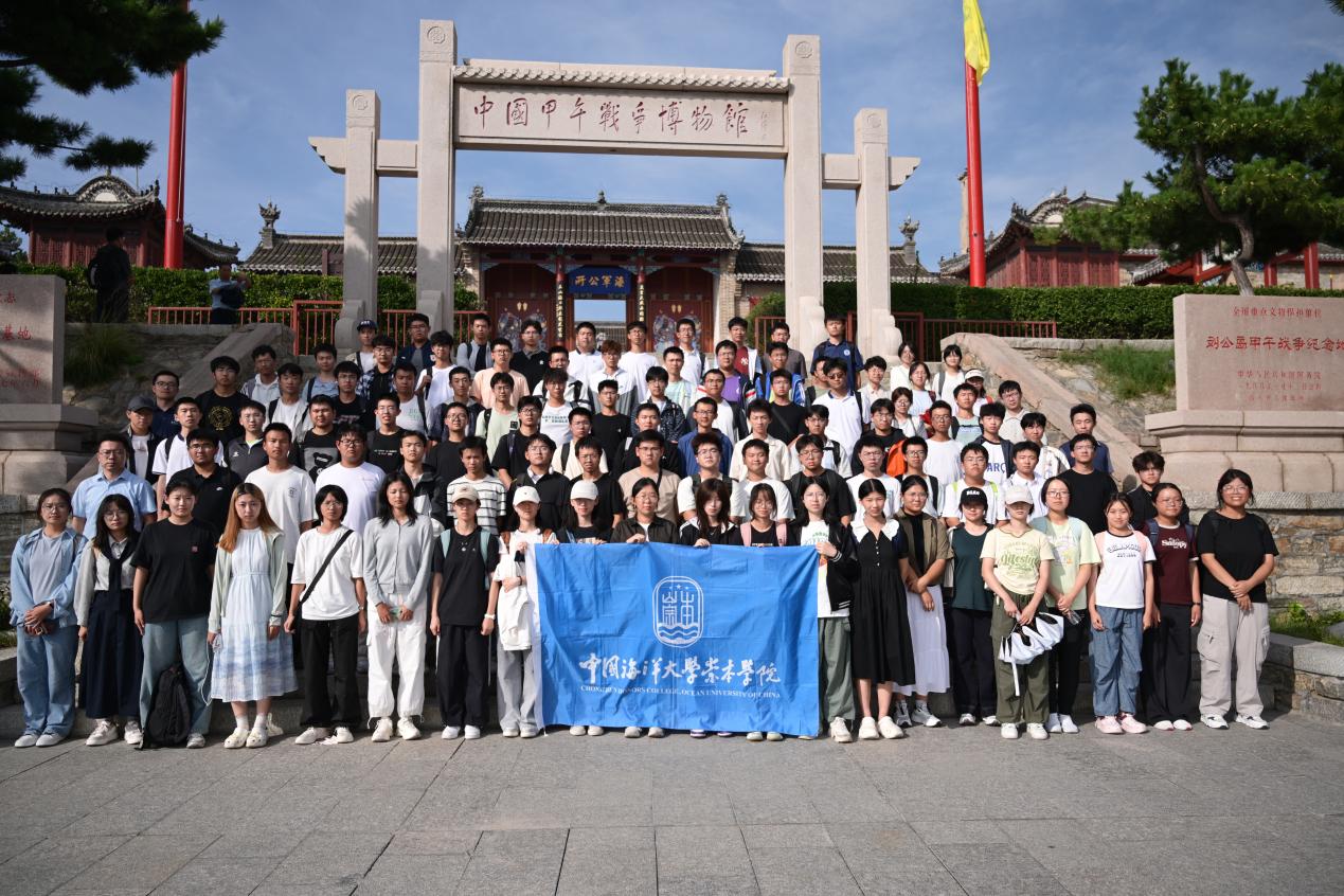 在中国甲午战争博物馆陈列馆,“序厅”“甲午战前的中国和日本”“甲午战争”“深渊与抗争”“警钟长鸣”五大展区,以丰富的文物、场景复原和互动体验,全景式展现甲午战争的历史脉络。从“致远舰”部分残骸、清军水师提督丁汝昌的战袍,到日军作战地图、签订不平等条约的文献复制品,每一件展品都承载着近代中国“向海而衰”的沉痛记忆。同学们通过动态沙盘和光影效果,直观感受当年海战的惨烈,深刻理解“国家不强,海权不固”的历史教训。进一步明确“向海图强”的时代责任,作为未来海洋科学领域的拔尖人才,将以历史为鉴,用专业能力守护国家蓝色国土。随后,同学们还一起参观了东泓炮台遗址和历史选择展馆。