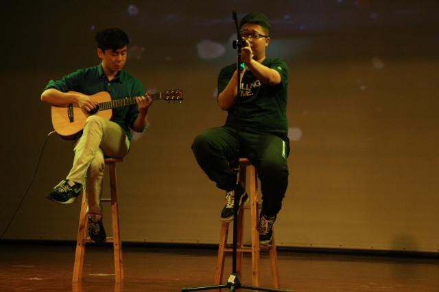 晚会共分三个篇章,包括歌舞、相声、朗诵、视频、书法等多种形式。由毕业生李子圣和孙鹤演唱的歌曲《回到拉萨》声音低沉情感饱满,诉说着对拉萨的感情和离别的不舍;古典舞《绽双华》聚光灯下,时而灵巧,时而妩媚;《贝加尔湖畔》结合二胡和书法表演,为毕业生送上真诚祝福;留学生节目《我们毕业了》,带着对中华文化不变的爱,满怀对周荣老师的感恩;现代舞《good boys and girls》激情四溢充满活力;相声《一个高尚的纯粹的脱离了低级趣味的相声》细数曾经欢笑岁月;歌曲《凤凰花开的路口》由文新学院辅导员演唱,悠扬的旋律满满的对毕业生的鼓励和期望。毕业生张梦是14级新闻传播学二班学生班主任,她和几位学生代表一同演唱歌曲《爱因为在心中》,表达想说还未来得及说出的感谢。