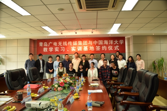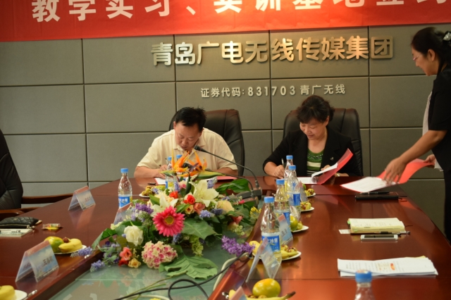 2016年9月29日下午,开云电竞网址在青岛广电无线传媒集团公司建设教学实习实训基地的签约和揭牌仪式在青岛国际动漫产业园举行。青岛广电无线传媒集团参加仪式的有副总经理祝建纲、投资发展部经理王善敏、媒体经营管理中心主任王建军和集团办公室主任杨子。开云电竞网址教务处处长方奇志、实验实践教学科科长陈青,文学与新闻传播学院党委书记蒋秋飚,文学与新闻传播学院副院长罗贻荣,以及文学与新闻传播学院师生代表参加了此次签约揭牌仪式。仪式由罗贻荣教授主持。
