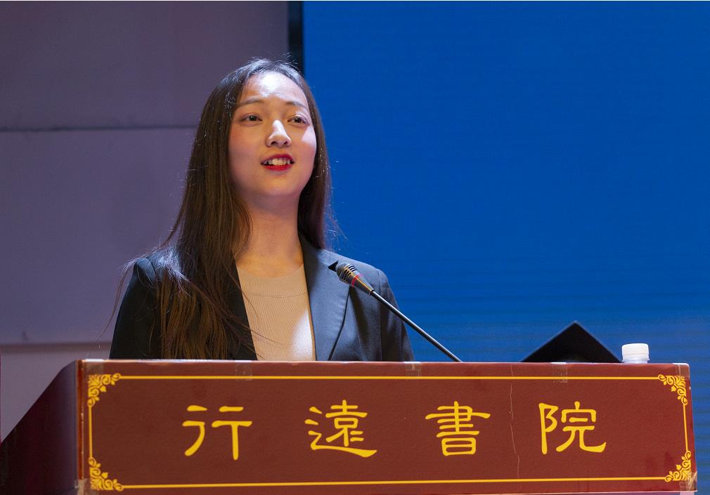 环境科学与工程学院2015级环境工程专业何雪雁同学作为结业生代表发言。在发言中,她回忆起两年前在书院暑期培训期间,虽然天气难忍,课业繁重,但同学们都欣喜于彼此的日渐成长;她回忆起在书院两年来学习与生活的点点滴滴,并将之比喻为一段绚丽多彩的旅行。从行远书院结业的二期生,将带着自己的荣誉与信念踏上新征程。她与二期生们共勉道,在未来的日子里要继续谦虚善良,充满正义;要倾听别人,接受多元并感同身受;要心中有路,继续大胆行动。最后,她代表结业生向支持书院建设的学校领导,向书院任课老师和办公室老师表达了真挚的感谢和感恩之情,祝福书院“理念传承,桃李芳华”。