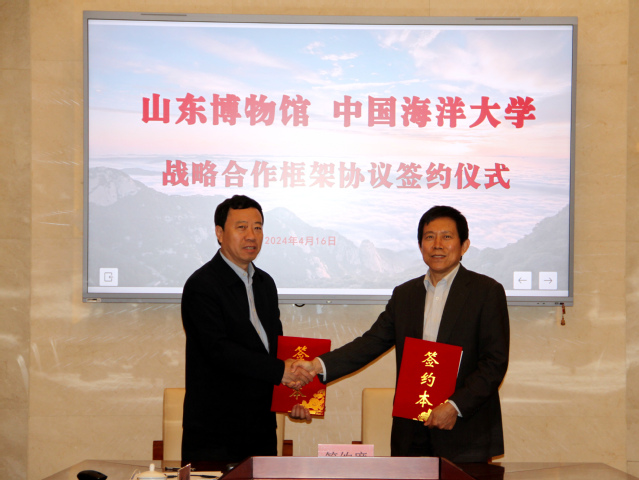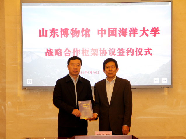 修斌介绍了文新学院的历史渊源、学科发展、专业建设等基本情况,并重点介绍了文物专业硕士在海洋文物与文化交流、海洋文化遗产等特色方向的设置思路,希望通过战略合作实现资源优势互补,携手共同发展,加强文物保护利用、文化遗产保护传承和文博人才培养工作。接着,双方共同观看了开云电竞网址宣传片、文新学院宣传片。随后,修斌与刘延常共同签署了《馆校战略合作框架协议书》。根据协议内容,双方将在课程开发、学术交流、科研合作、项目实施、人才培养、共建实验室或协同创新中心、建设实习基地等领域全面展开合作。签约仪式结束后,修斌代表学院向省博赠送了团队在海洋文化研究领域的最新成果。