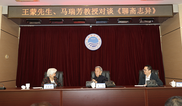 5月7日上午,《王蒙先生、马瑞芳教授对谈聊斋》在图书馆第二会议室举行。王蒙先生与著名古代文学专家、山东大学马瑞芳教授就《聊斋志异》展开了深入、精彩对谈。对谈由文学与新闻传播学院熊明教授主持。吸引了200余名师生到场聆听。在持续一个半小时的对谈中,王蒙先生、马瑞芳教授以《聊斋志异》为切入点,始于“聊斋”而不囿于“聊斋”,围绕文学、人生、历史等众多话题展开思维碰撞,为现场师生打开了阅读与思考视野,带来了宝贵的启发。对谈最后,王蒙先生呼吁,好书要好好读,不要被手机段子所戕害,要多读世界经典。