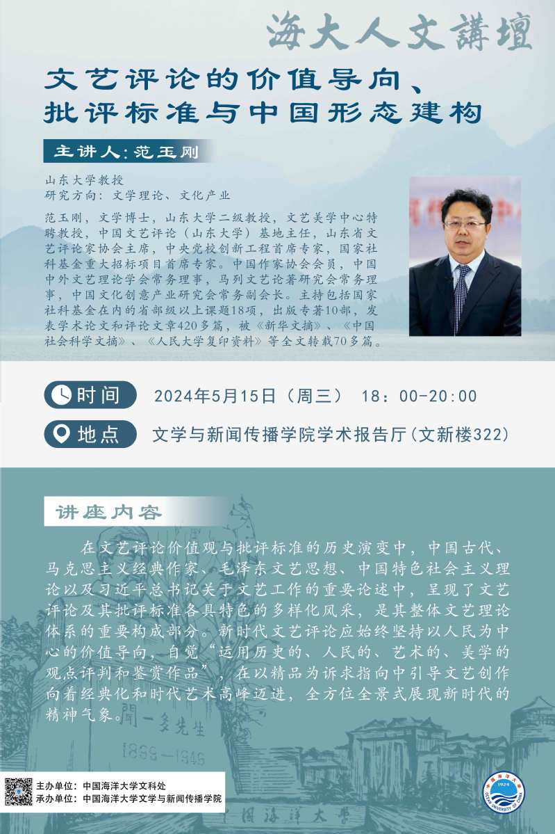 【海大人文讲坛】范玉刚 | 文艺评论的价值导向、批评标准与中国形态建构