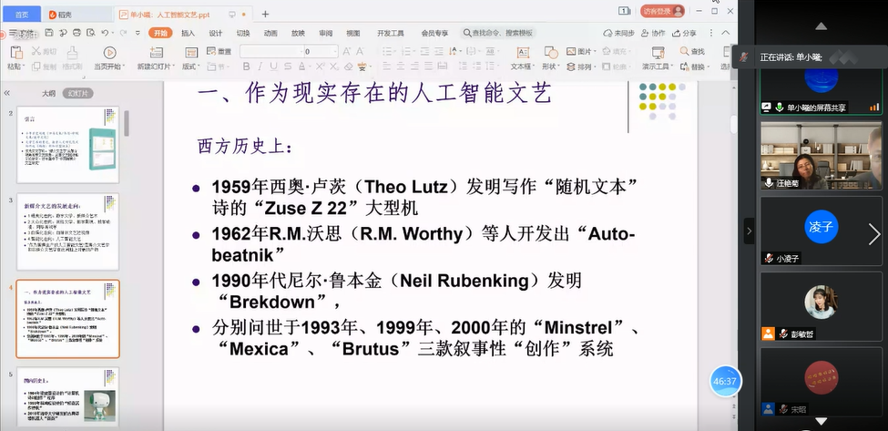 在大会主题发言环节,东南大学人文学院副院长、国家社科基金重大项目“明清小说戏曲图像学研究”首席专家乔光辉教授作了题为《文学图像学研究之反思》的汇报。杭州师范大学人文学院教授、国家社科基金重大项目“中国新媒介文艺研究”首席专家单小曦的发言题目为《作为智媒生产的人工智能文艺》。乔教授分享了明清小说戏曲图像学研究领域的问题与反思、未来研究趋势与研究意义等重要问题。单教授的汇报共分为五个部分:作为现实存在的人工智能文艺;从人类文化到超人类文化;从再现(表现)论、文本论、接受论到媒介论;从工具、主体创造到智媒生产;人工智能文艺对人类文艺的僭越。