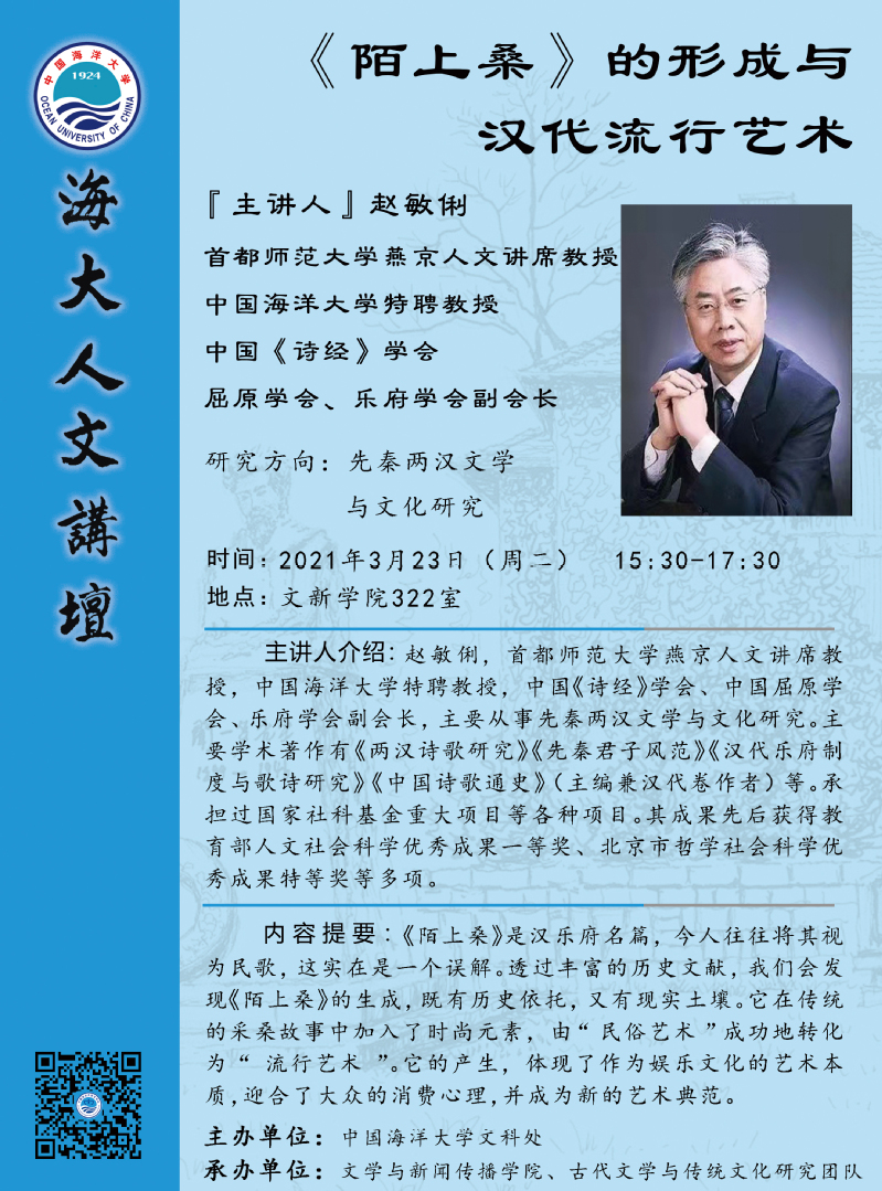 【海大人文讲坛】赵敏俐:《陌上桑》的形成与汉代流行艺术