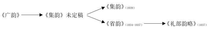 从《省韵》的辑考来看,《集韵》未定稿缩减为《礼部韵略》不是一步到位的,丁度等人先是刊修《广韵》,后为满足科举需要而从未定稿中减缩出《省韵》,该未定稿与《省韵》是详略二书,跟《广韵》《韵略》为详略二书一样。后来,此未定稿进一步编修而成《集韵》,《省韵》或其修订本则在贾昌朝奏请之后进一步修订为《礼部韵略》。《礼部韵略》《集韵》的成书过程,可作示例图如下: