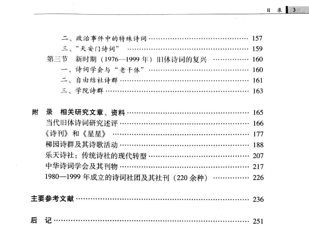 还有对旧体诗词群体和社团的研究,如张海鸥《当代格律诗词四类诗群概观》、张一南《当代旧体诗词三体并峙结构的初步形成》、陈友康《论20世纪学者诗词》、刘士林《20世纪中国学人之诗研究》、李仲凡的博士论文《新文学作家建国后旧体诗写作研究》、王艳萍《新文学家的旧体诗词书写与文化心理研究》、曾艳《现代新文学家的新诗、旧体诗比较》、杨子怡《古今诗坛“老干体”之漫论》、胡迎建《当代诗词社团及其作者状态评述》、马大勇《近百年词社考论》、彭敏哲《稊园诗群及其诗歌活动考论》《传统诗社的现代转型——以乐天诗社为中心》《梅社女性诗群的形成与承续》等。
