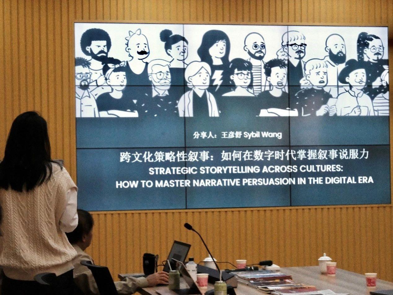 王彦舒本科毕业于著名的美国密苏里大学新闻学院,在探索频道(Discovery Channel)工作数年后,又在美国西北大学获得传播学硕士学位,目前正继续读博深造。此次交流,王彦舒主要从学习起始、业界观察心得、未来研究兴趣三个方面展开。首先,她围绕本科阶段融合新闻学的学习经历就跨文化新闻叙事所面临的挑战等问题展开了探讨,指出社会对多元化叙事技能的持续需求。接着,王彦舒结合自己的工作经历,通过展示《这,就是贵州》(“CHINA’S TREASURE: GUIZHOU”)、《2018耐克中国“全凭我敢”》(“Dare to Become”)等项目、品牌优秀的跨文化叙事事例,向大家讲述了自己在实践中的心得体会。最后,根据自身研究兴趣,王彦舒分享了她对叙事说服力、人工智能干预措辞进而影响人们的内容感知等问题的个人思考。