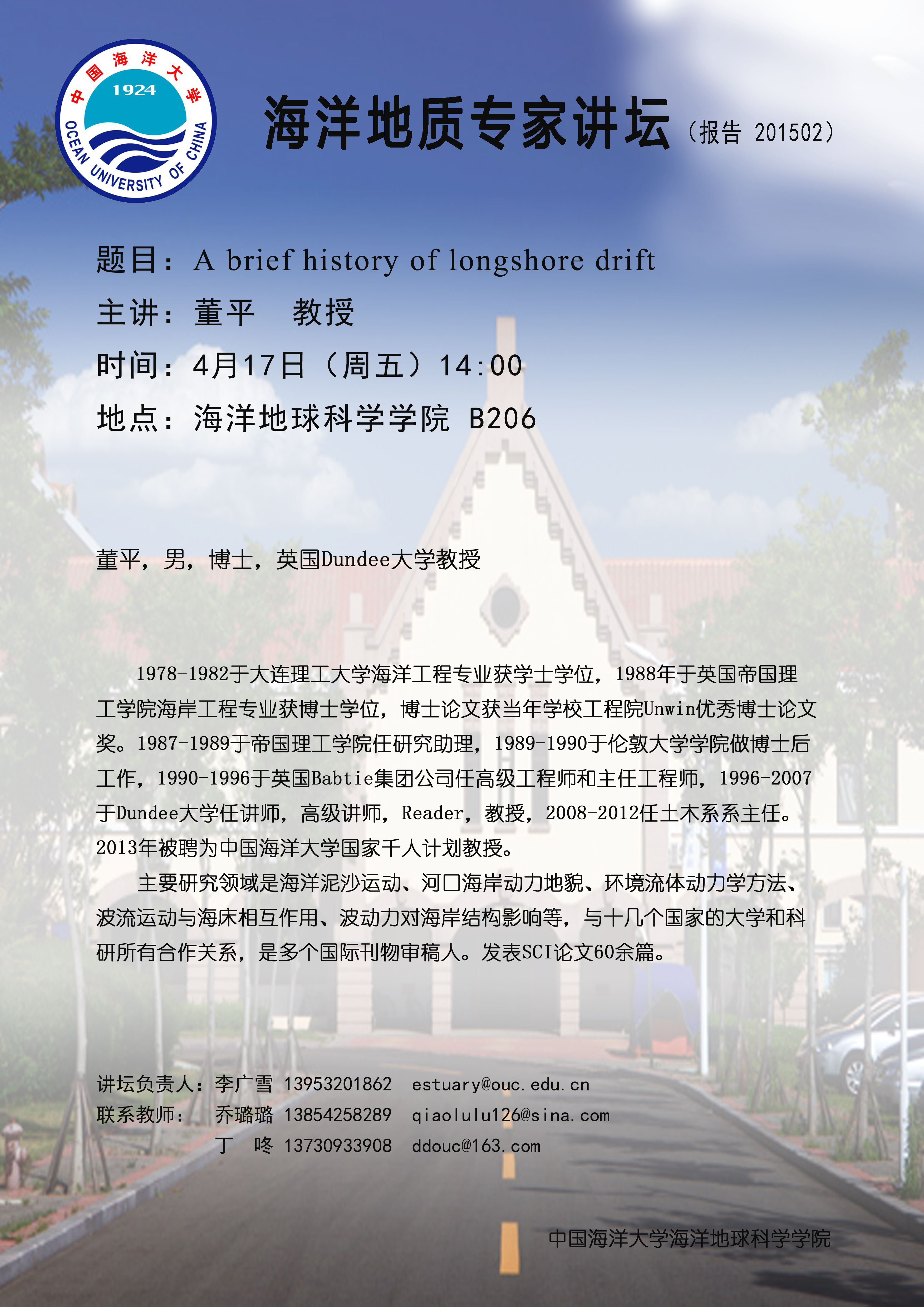 通讯地址:青岛市崂山区松岭路238号 海洋地球科学学院 邮编:266100 电话/传真:0532-66782488