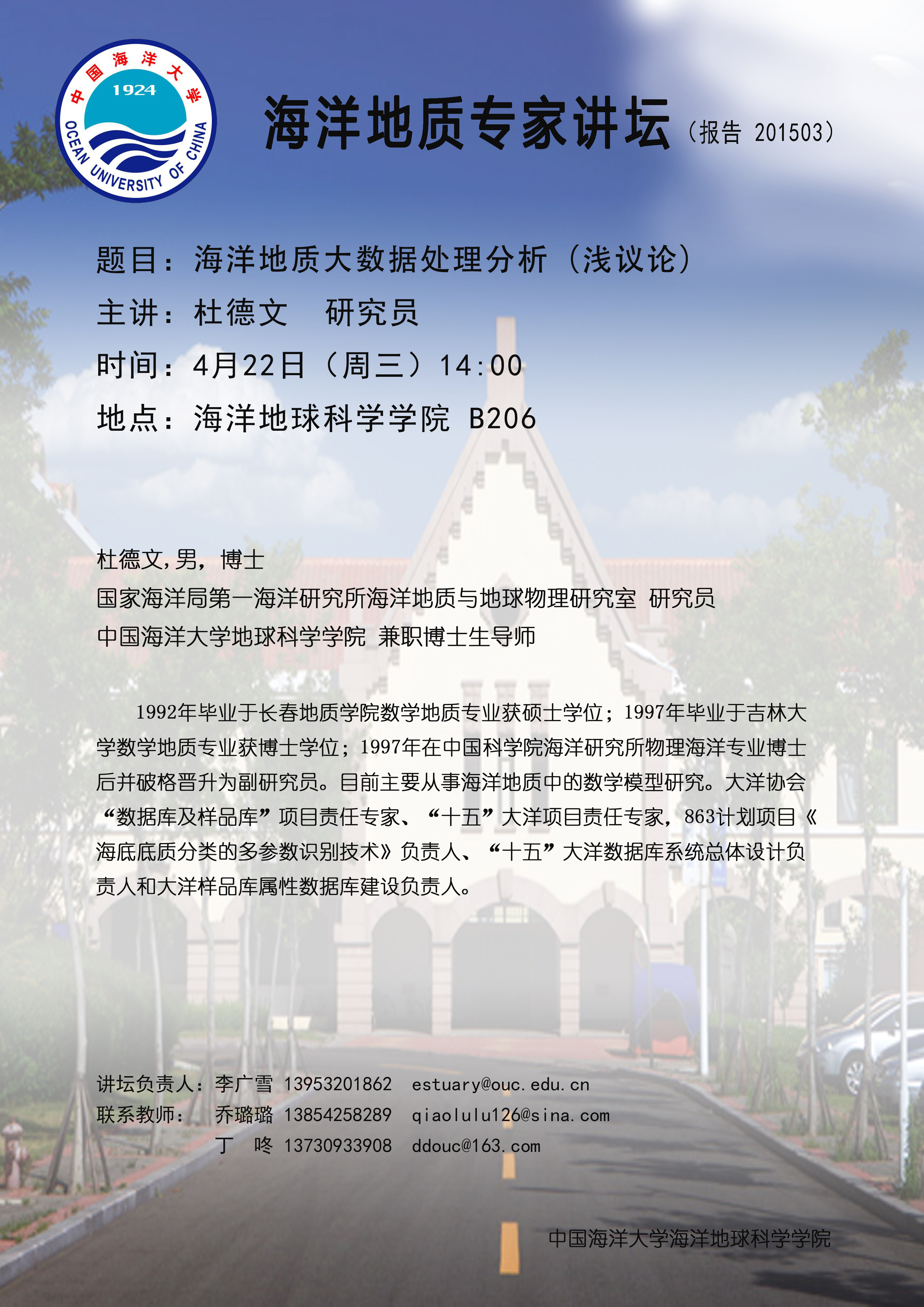 通讯地址:青岛市崂山区松岭路238号 海洋地球科学学院 邮编:266100 电话/传真:0532-66782488