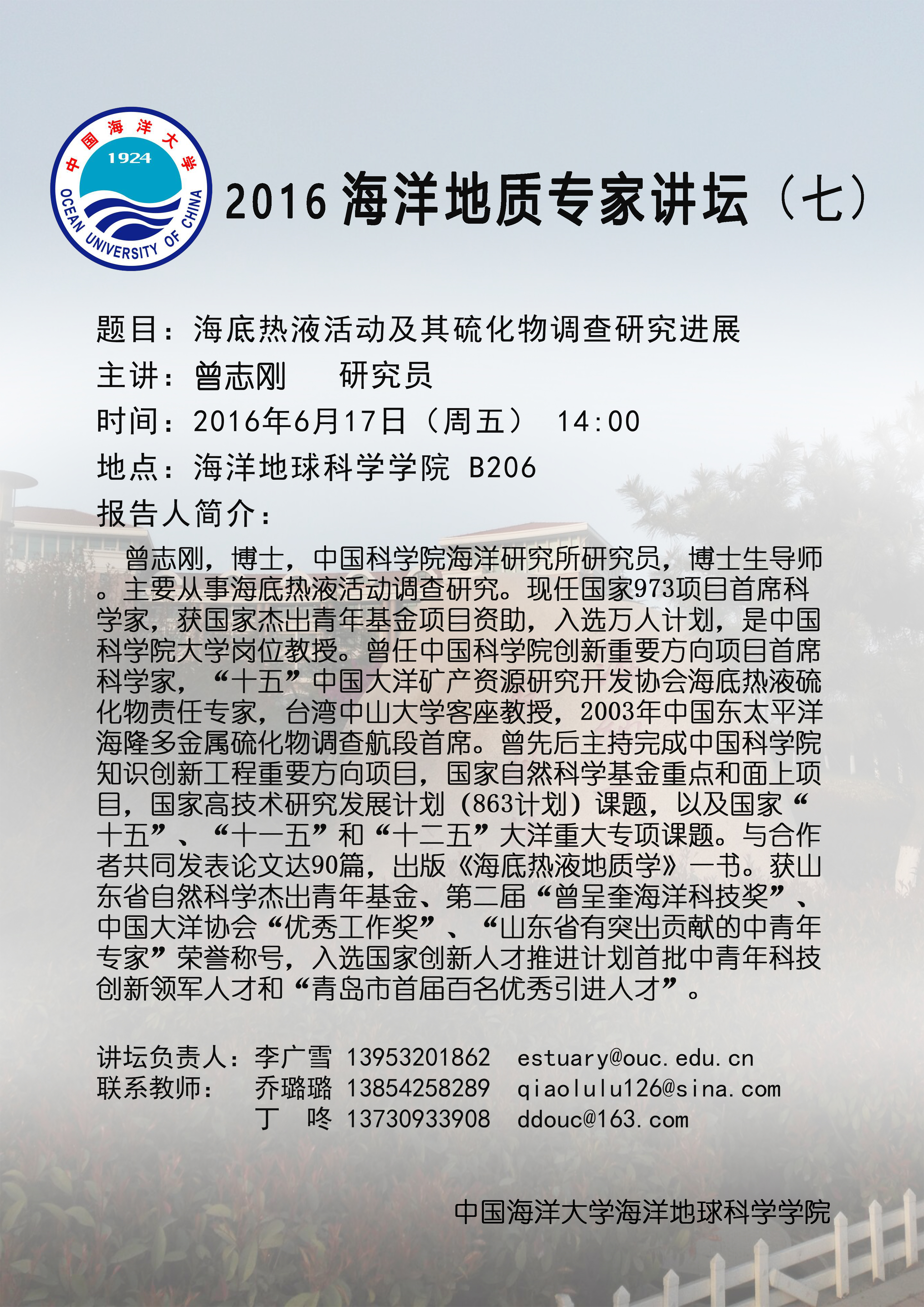 通讯地址:青岛市崂山区松岭路238号 海洋地球科学学院 邮编:266100 电话/传真:0532-66782488