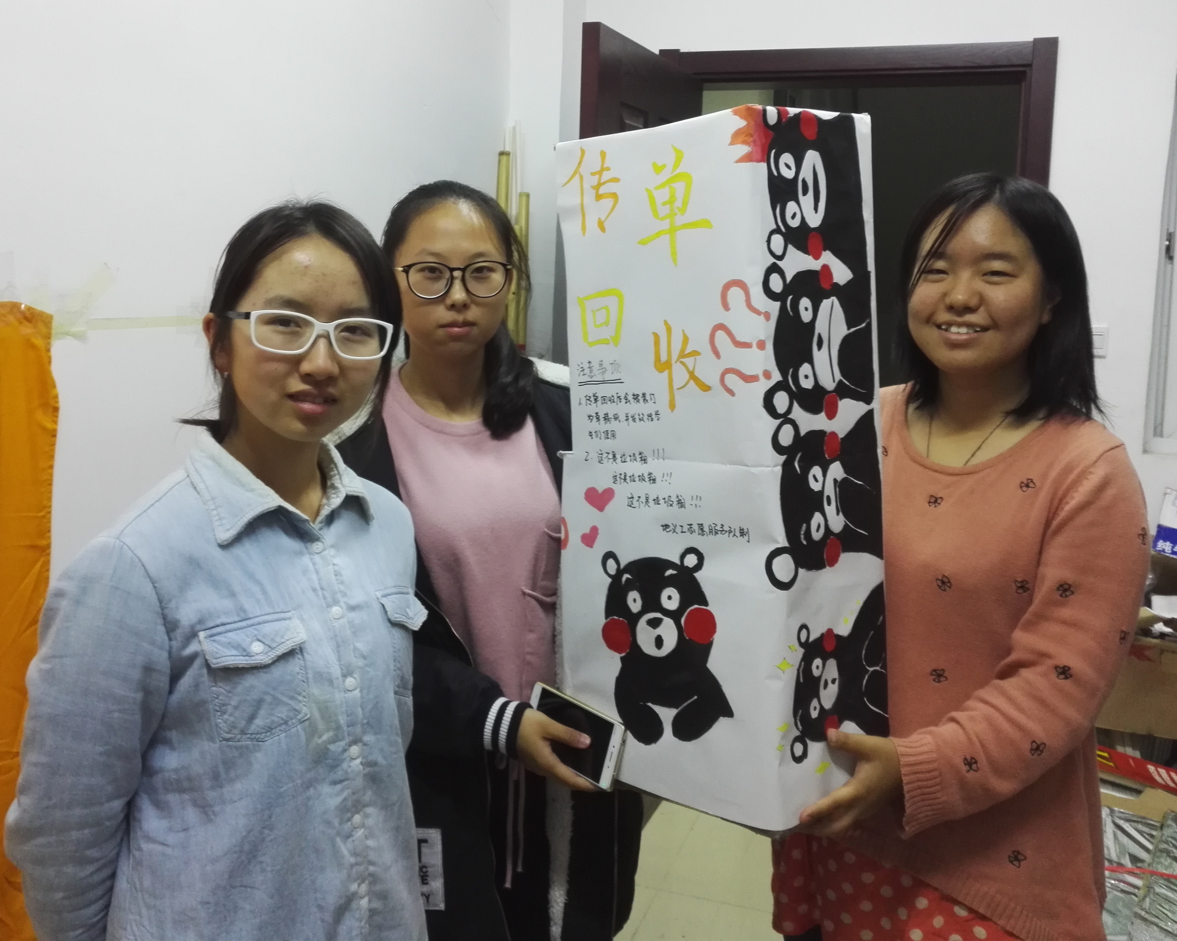 据地义工的负责人解释,回收的普通传单将整理装订为演草纸向学生免费发放,彩色传单将统一送至回收站进行重制利用。这些回收箱目前被安置在了第一、二餐厅的门口。仅仅一周,从回收箱中收集的传单就达到了5公斤,可谓“战果累累”。