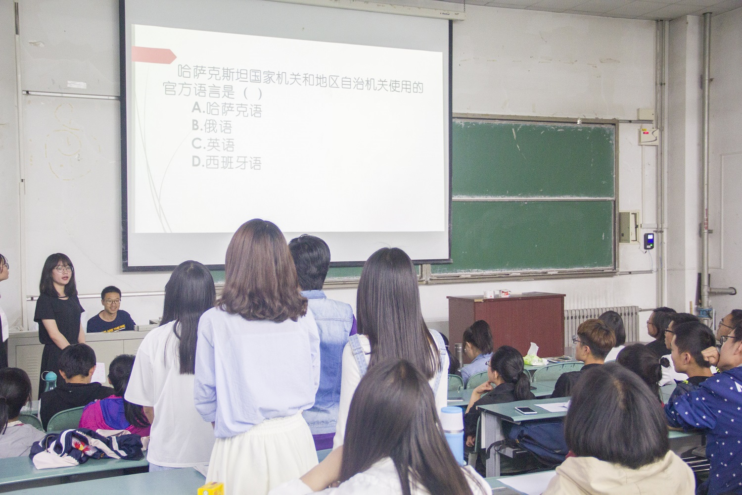 晚上六点,比赛正式开始。首先进行的是组间车轮战,十六组选手随机抽签进行对决。每个队伍有三次使用特权的机会,分别包括跳过本题、场外求助和去掉一个错误答案。比赛一开始,紧张的气氛感染着每一组参赛队员。最先开始对决的队员不幸在第一题就败下阵来,惨遭淘汰,为接下来比赛的选手们敲响了警钟,之后依次上场的选手也变得更加谨慎。很多刁钻的怪题并没有难倒机智的选手们,激烈的对决引起场上掌声频频。经过多轮激烈的角逐,最终有八组选手率先晋级决赛。