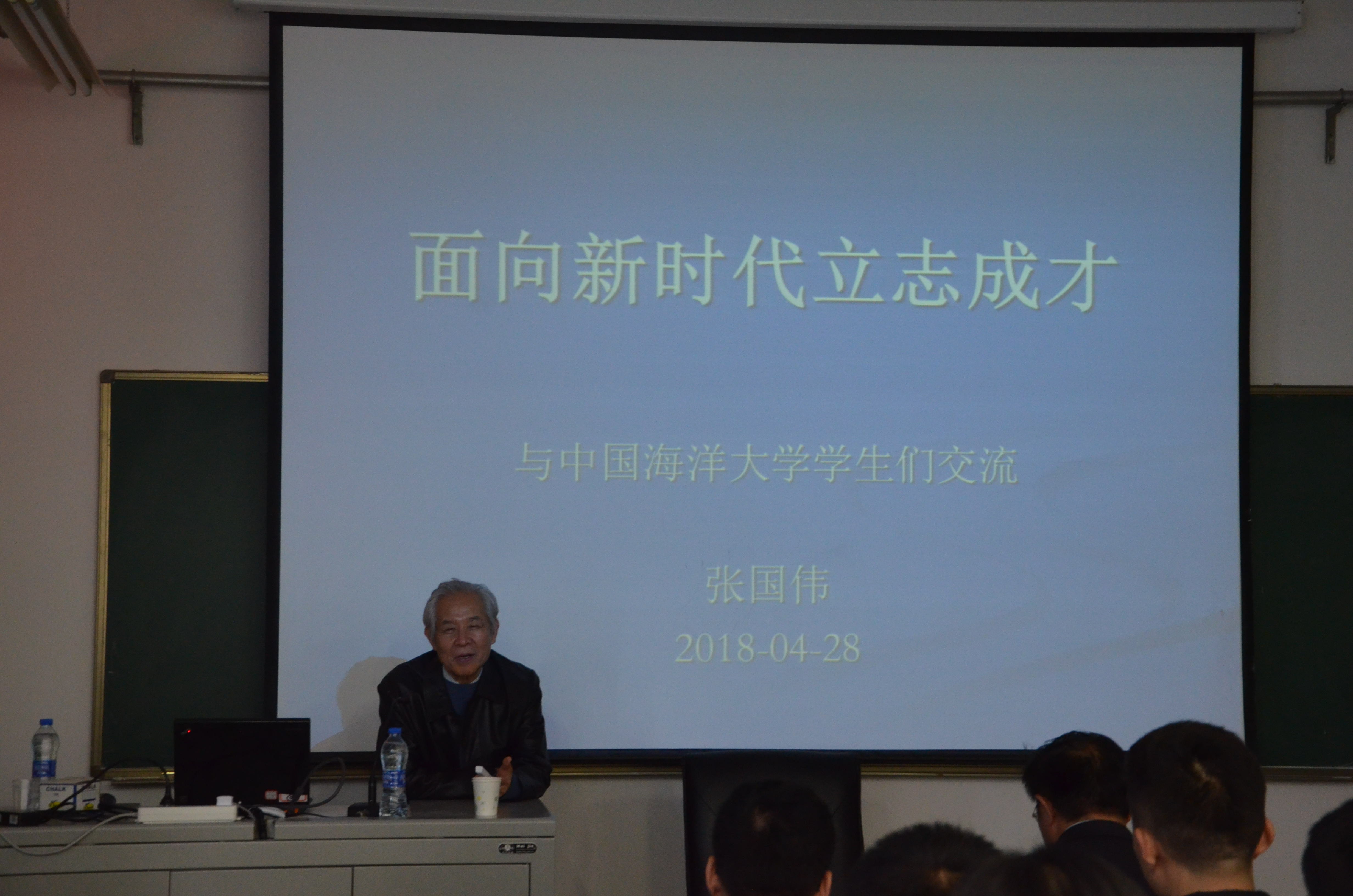 讲座伊始,张国伟院士结合自身发展,运用自然科学和社会科学的渊博知识,深度解析了人、自然、社会三者之间的相互关系,指出人的价值莫过于把自己的聪明才智贡献给人类。鼓励同学们多看艺术、文学、历史书籍,增强个人品味和志趣,避免沉溺于手机世界中的缥缈与时髦,在现实时空的巨大格局下,思考人生,在新时代找准定位,劝诫同学们实现自我价值,要有竞争意识,但绝不能弄虚作假、争抢风头、排挤他人,并用诗句“海阔凭鱼跃,天高任鸟飞”来鼓励大家大气、大度、大胆展现智慧,为“海洋强国”建功立业。