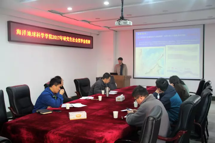 本站讯 11月20日上午,海洋地球科学学院2017年研究生社会奖学金答辩在学院B205举行。答辩会由学院党委副书记、副院长张殿镇主持,团委书记张婧、辅导员王可佳以及各系所负责人及研究生导师代表参加答辩会,并担任评委。