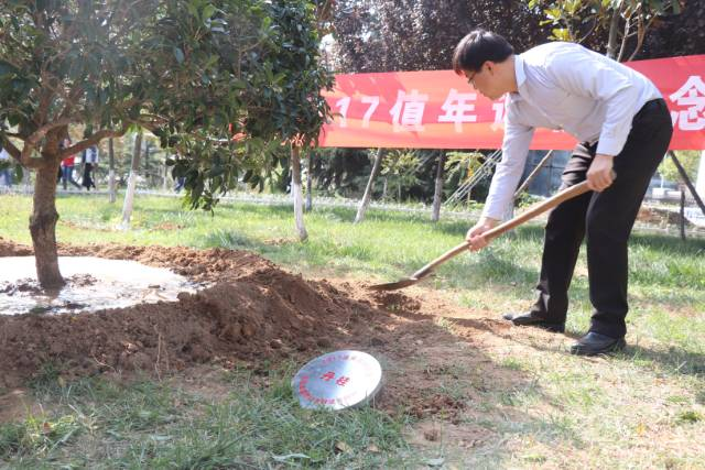 之后,各地校友会的代表在学校南门东侧共同种植下丹桂树。古有科举折桂,97届英语专业、青岛金融界校友联谊会会长张俊涛今赠丹桂希望我校学生也能如绿树般枝繁叶茂,希望学校桃李满天下。