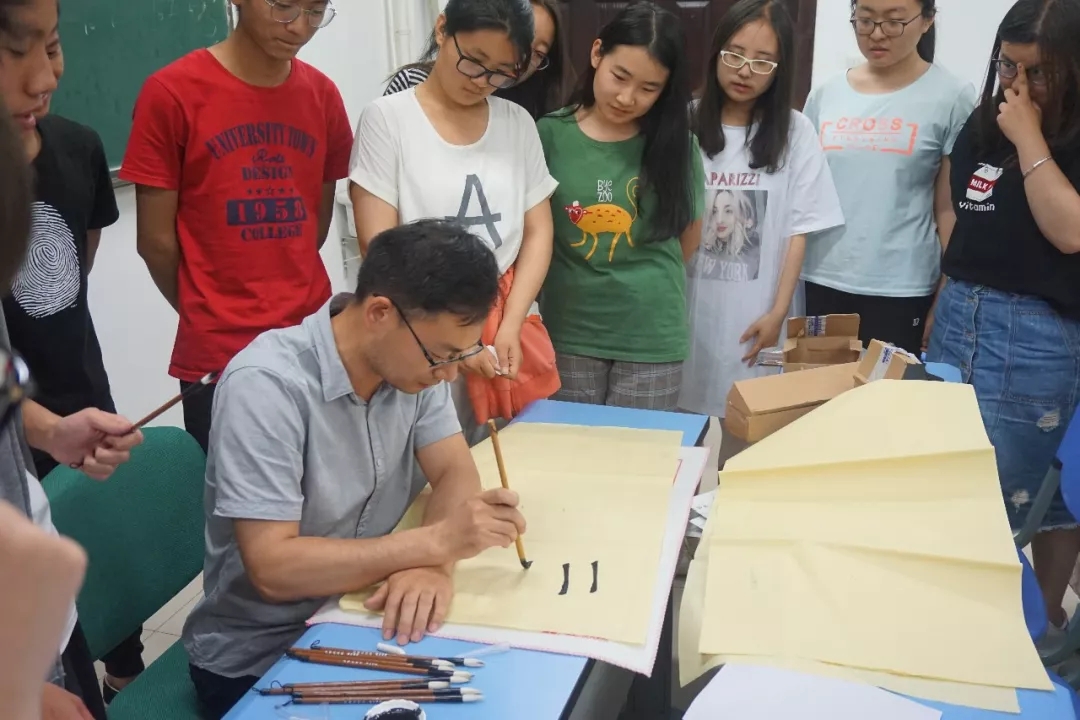 在学习了书法基础知识后,黄老师讲解了书法执笔方法,并进行了现场演示,对同学们的执笔姿势进行一一指导。紧接着,黄老师从楷体“长横”的书写入手,讲解了基本要领后,让同学们进行实战练习,同学们跃跃欲试,兴致高涨。在练习的过程中,黄老师耐心地给每一位同学进行指点和示范,期间老师和同学们不 本次书法写作交流在轻松愉悦的气氛中圆满结束。通过本次交流会,同学们不仅初步掌握了书法写作的技巧,课余生活得以充实,还让同学们感受到了中国书法的魅力,对书法写作业有了更深的理解,在一定程度上提高了同学们的学习书法的热情。