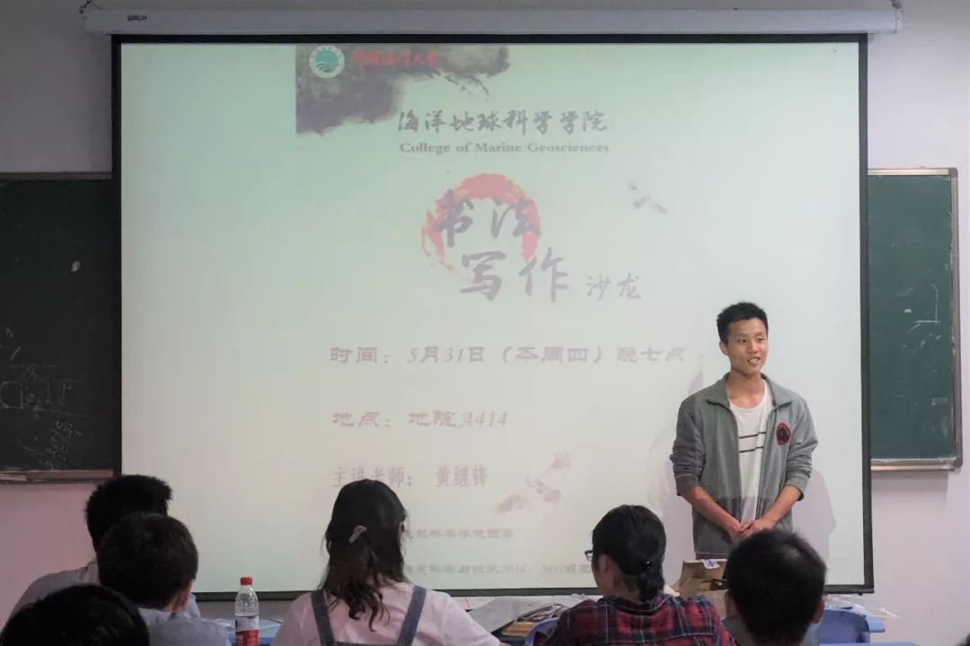 本站讯 为丰富师生的课余生活,在培养学生兴趣的同时,进一步促进师生之间的交流。5月31日晚,海洋地球科学学院(以下简称“地院”)书法写作沙龙第十期交流会在地质楼A414教室顺利举行。本次书法写作交流会邀请了地院黄继锋老师为同学们讲解书法相关知识。