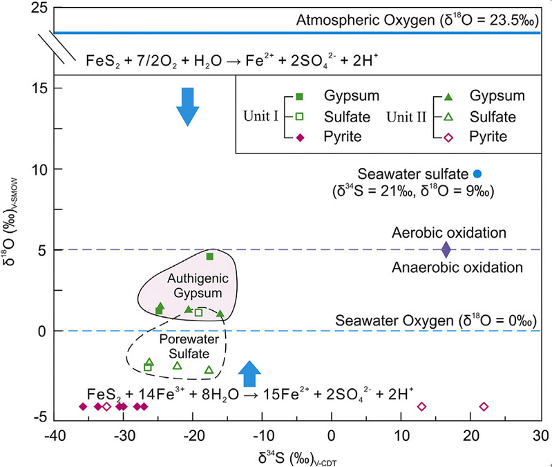 通过重矿物分离的方法在显微镜下手挑出自生石膏后,分别测试其硫和氧同位素(图3),结果显示,自生石膏的硫同位素明显负偏,代表其来源于自生黄铁矿(微生物硫酸盐还原的产物)的氧化。通过端元计算,显示大约70%的硫来自自生黄铁矿。氧同位素的结果也是明显负偏,证明该自生石膏是原位生成的,不是在后期沉积物保存过程中形成的,而是形成在沉积物中的厌氧氧化阶段。