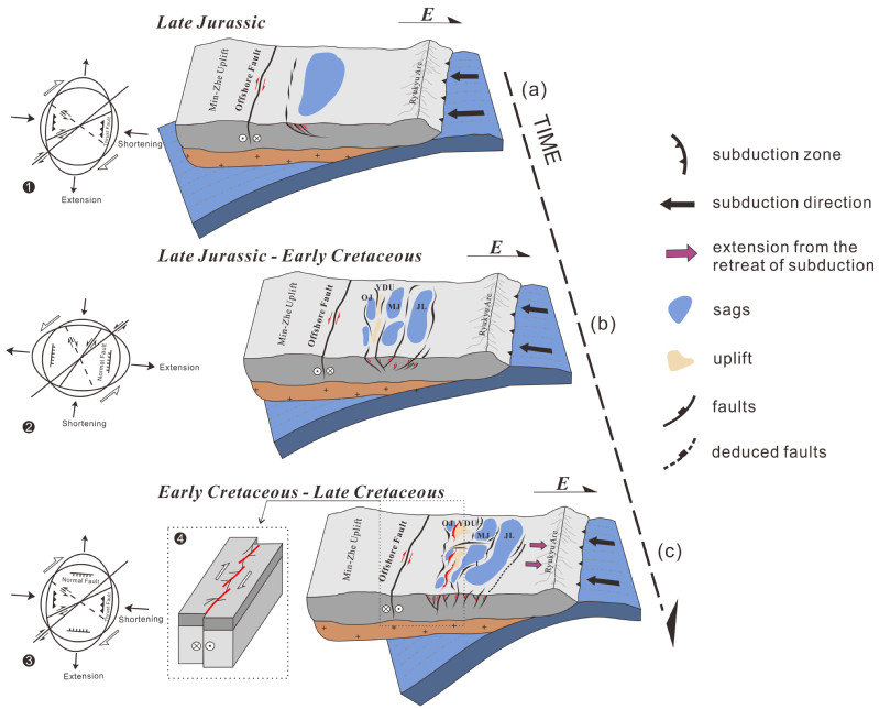 文章选取中生代地层发育的东海陆架盆地南部为研究区,通过计算研究区内不同凹陷的生长指数,详细分析各次级构造单元的结构与构造特征,并结合砂箱模拟的实验结果,认为瓯江凹陷属于在长乐-南澳断裂带走滑作用控制下形成的走滑拉分盆地,而闽江与基隆凹陷未受走滑影响,属伸展型盆地。并认为盆地的演化过程在断裂带三期走滑运动的控制下也可分为三个阶段(图2):中晚侏罗世,伊泽奈崎板块斜向俯冲,断裂带北东东向以挤压为主的右行剪切导致盆地内产生 NW—SE 向的压扭构造;晚侏罗世-早白垩世,伊泽奈崎板块逐渐地转至北西向,导致断裂带变为左行-逆冲韧性剪切变形。瓯江凹陷处原 NW-SE 向压扭性构造沿该方向拉伸成为洼陷;早、晚白垩世之交,古太平洋俯冲板片后撤,区域应力场由压扭变为张扭,断裂带右行走滑剪切,瓯江凹陷地区受其作用逐渐变形、组合成左阶雁列式形态。而闽江、基隆凹陷则由于距离长乐—南澳断裂带较远,只在拉伸背景下不断生长成为伸展型洼陷。