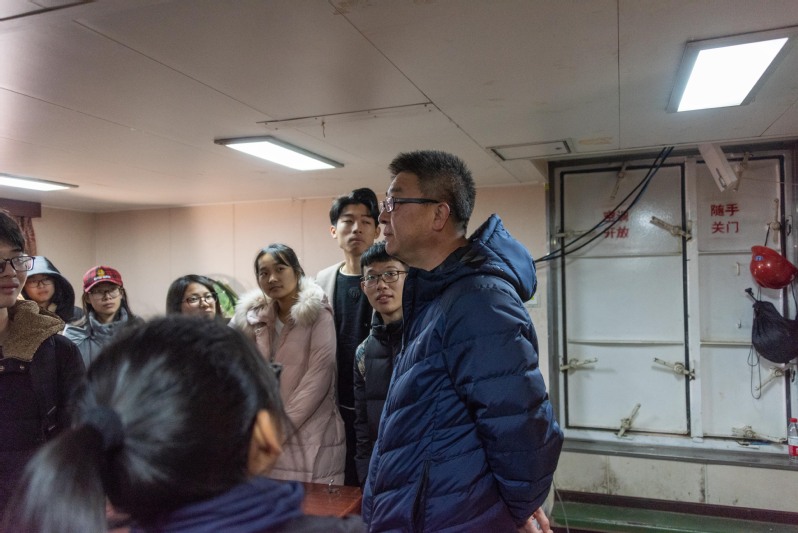 同学们首先来到“向阳红18号”科考船,据介绍,“向阳红18号”是我国1500吨级中最先进的海洋科考船,主要用于渤海、黄海、东海、南海等海域的海洋科考工作。在船长的带领下,同学们先后来到驾驶舱、实验室和轮机库,参观了先进的探测仪和各类电子海图。纸质海图到电子海图的变化,给海上航行带来了极大的便利。同学们认真聆听,积极提问,船长都给予了耐心的解答。