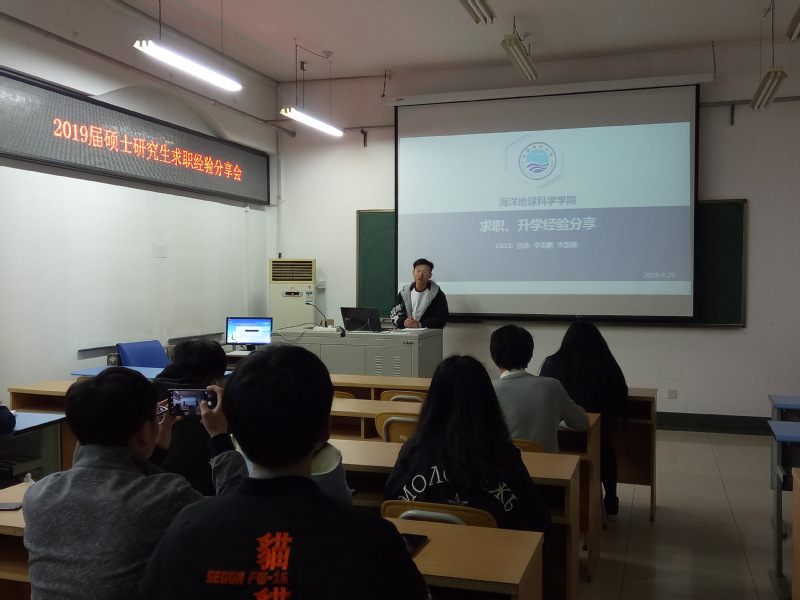 4月29日晚,由海洋地球科学学院研究生会承办的2019届硕士研究生求职经验分享会在地质楼B206成功举办。会议由研究生会副主席王佳佳主持。2019届硕士毕业生吕纪轩、白冰、李志鹏、李凯瑞、张自豪作了分享和交流。