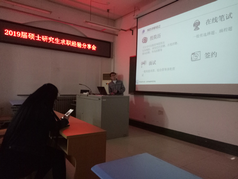 2019届地球探测与信息技术专业硕士毕业生李凯瑞,现已签约华为技术有限公司。他就自己的求职经过和流程做了简要分享和交流。他强调,金九银十并不适用于互联网行业。互联网行业招聘,从6月份开始,经过7月份,到8月底就基本结束了。另外,他将自己求职经历的每个具体步骤作了详细介绍,包括笔试考试内容、面试问题、项目经历、专业问题、压力测试、综合面试等。最后,有同学就岗位是否存在性别歧视做出提问,他认为只要你能力OK,性别上不是问题。
