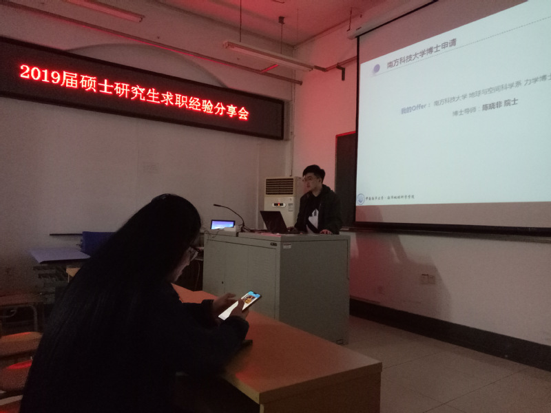 2019届地球探测与信息技术专业毕业生白冰,同时获得南方科技大学地球与空间科学系(简称“地空系”)博士录取资格和中国银联上海总部应用开发岗等Offer。他就如何考博和如何求职两部分做了分享和交流。在如何考博部分,他首先简要介绍了南方科技大学地空系,然后该系的夏令营的流程、学术交流答辩、食宿报销情况,以及申请博士录取方式等作了简要介绍。在如何求职部分,他根据自身经历,就投简历和多轮面试流程等作了分享。
