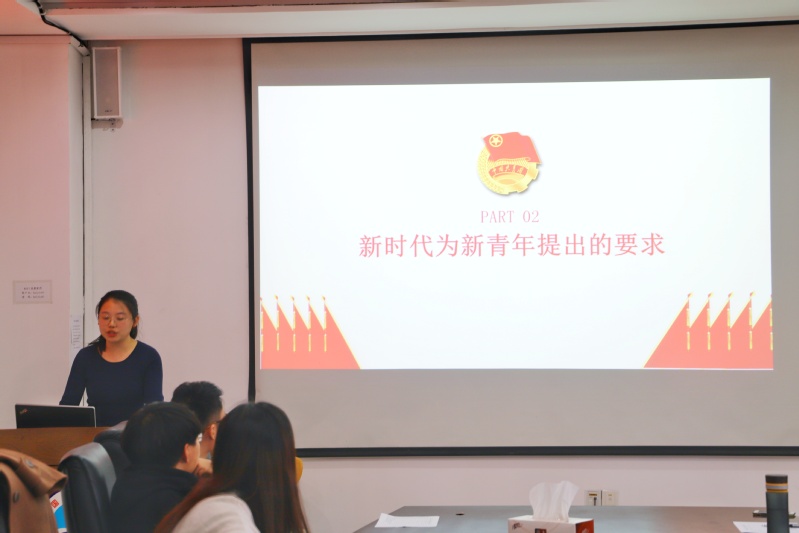 其中18地科系硕士团支书李燕妮在题为“我们都是追梦人”的展示中,以同名歌曲《我们都是追梦人》引出了主题——“新时代青年应如何成为追梦人、怎样成为圆梦人”,并以杜富国、朱婷、黄文秀与付国豪等爱国新青年的事迹为例,从“青年!新青年!”、“新时代为新青年提出的要求”、“新青年不忘跟党走”、“做有担当的新时代新青年”四个方面出发,详细讲述了身为新时代新青年的使命与担当。