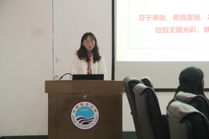 18级地球信息科学与技术团支书付可意以“谋海济国海大情,青春五四地院人”为主题,并分别从“他们的时期”、“你们的时间”和“我们的时代”三部分开讲。在第一部分“他们的时期”中她讲述了巴黎和会上中国代表拒绝在《凡尔赛和约》上签字的历史,当时的青年们胸怀满腔爱国之情,为中国利益据理力争。在第二部分“你们的时间”中,她对身边同学的手机软件使用时间进行统计,得出了惊人的结论:很多当代大学生在游戏和社交软件上花费了大量时间。在《习近平的七年知青岁月》这本书中可知,习近平总书记和我们年龄相仿时就带领乡村人民修桥修路、发家致富,而我们却把大好的时光浪费在游戏上,这引起了大家的深思。她在第三部分“我们的时代”中提出,作为新时代青年,我们应当埋头读书,学习专业知识,心怀谋海济国的海大之情,并在展示结尾发出号召:“时代在召唤我们,我们也必将不负时代。”
