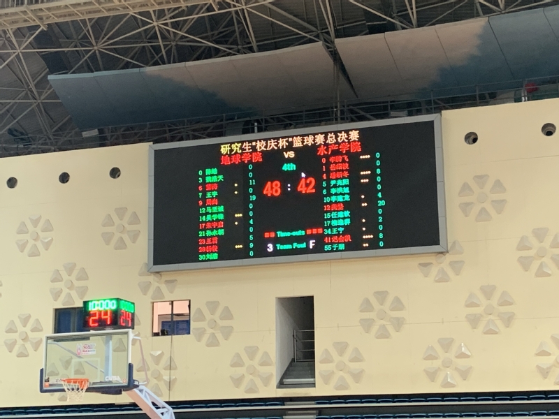 最后一节中,我院保持着上节中势如破竹的气势,由9号周尚率先进攻,持球快速推进,直冲水产学院的禁区,突破、起跳、投篮一气呵成拿下两分。6号董涛也依靠队友26号杨俊的助攻多次拿分,进一步将比分拉大,水产学院虽积极防守,但因队员体力下降而出现多次失误犯规,胜利的天平正向我院逐渐倾斜。随着裁判吹响哨子,我院以48:42的比分战胜水产学院,最终获得本届研究生“校庆杯”篮球赛总冠军。至此,2019年度研究生“校庆杯”篮球赛圆满落幕。