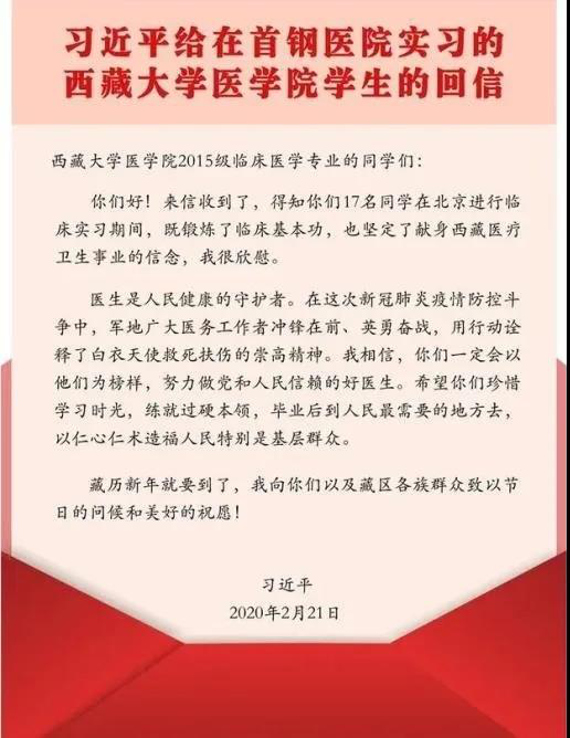 在藏历新年来临之际,中共中央总书记、国家主席、中央军委主席习近平2月21日给正在北京大学首钢医院实习的西藏大学医学院学生回信,肯定了他们献身西藏医疗卫生事业的志向,提出了殷切的嘱托和希望,并向他们以及藏区各族群众致以节日的问候和美好的祝愿。