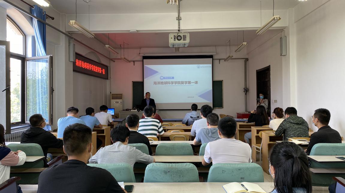 为强化对学生的教育引导,增强学生防疫意识,根据《山东省高等学校2020年春季学期开学工作指南》的工作要求和学校做好学生返校教育工作的统一部署,5月26日上午10时,海洋地球科学院学院在首批学生返校后第一时间组织开展了“复学第一课”。“复学第一课”由学院党委副书记,副院长张殿镇主讲,学院全体辅导员与第一批返校的学生共同参与了本次学习。