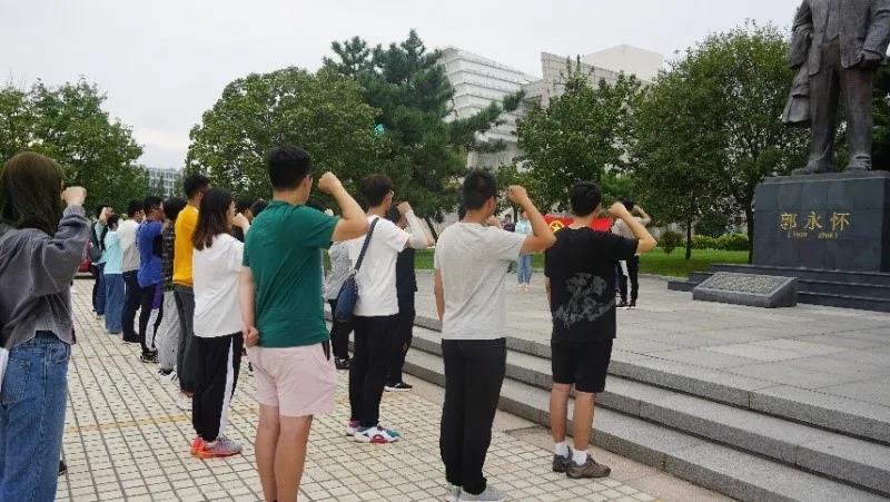 最后,在团员代表2017级地球信息科学与技术班团支书王子强的带领下,全体团员庄严举起右手,重温入团誓词。党员代表刘思雨同学带领海洋地球科学学院本科生党支部的六名党员,在郭永怀同志雕像前庄严宣誓,重温入党誓词。