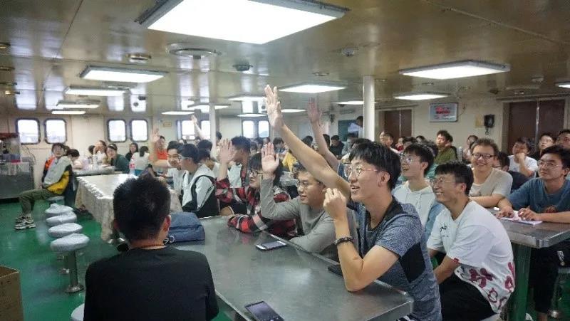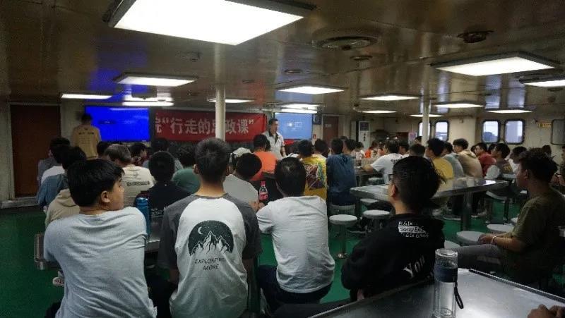 10月11日下午,在“东方红2”科考船上,海洋地球科学学院2017级全体同学在邢磊、刘勇、吴晓老师的带领下开展了一场特殊的“航行中的思政课”。