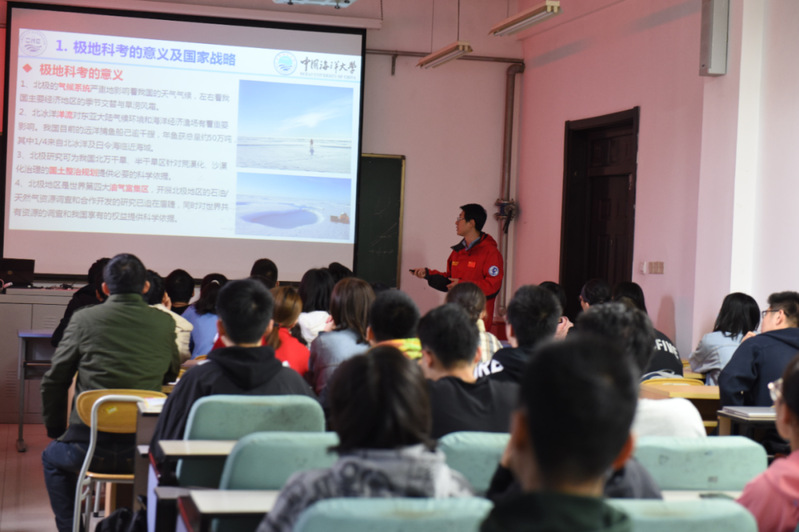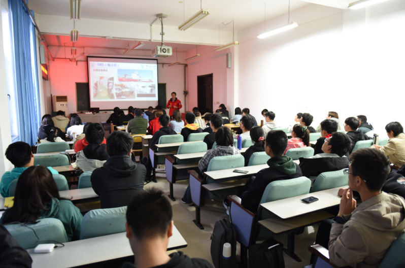 紧接着,邢军辉通过实时的工作状态、切实的数据记录向同学们诠释了科考人员所坚守的极地精神——爱国、求实、创新、拼搏,其中他特别强调爱国的必要性与重要性。他通过讲述自己异国他乡的见闻与经历告诫同学们要用个人的行动维护祖国的光辉形象,深刻体会“科学无国界,但科学家有祖国”的精神内核。最后,邢军辉从专业学习的角度,告诉同学们学习各专业的意义以及能为国家做出的贡献。他结合自身的求学经历指出,同学们应立足自己所学习的专业,确立明确的目标,在掌握知识基础的前提下对具体专业问题进行深入的研究,热爱并享受自己的专业,实现个人事业与海洋强国战略的顺利对接,继续谱写新时代实现中国梦的青春篇章。